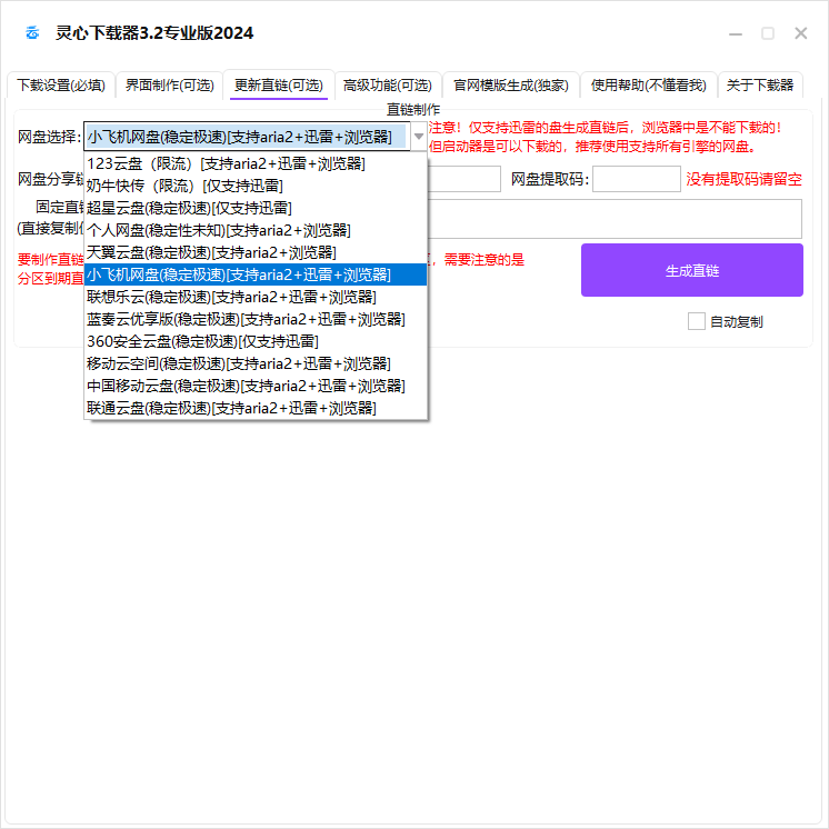 某些网盘同行需要通过挂载等来实现支持,且需要用户达到一定技术门槛,凌云下载器3.0所有网盘均为原生支持,您甚至只需要花10秒创建一个分享链接填到生成器,无需修改其他选项,即可生成下载器。